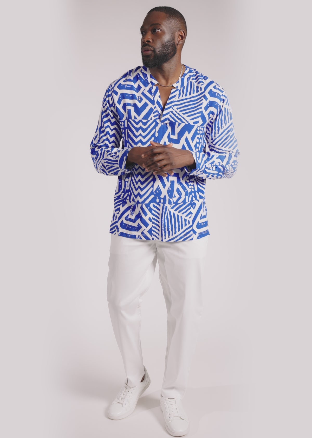 Ajisomo, meaning "wisdom" in Yoruba, gives a modern twist on traditional African attire. The tunic in White Cobalt Tribal print blends cultural richness with contemporary flair, featuring a distinctive print that commands attention. Ideal for versatile styling, it pairs seamlessly with white pants for a polished look or jeans for casual sophistication.