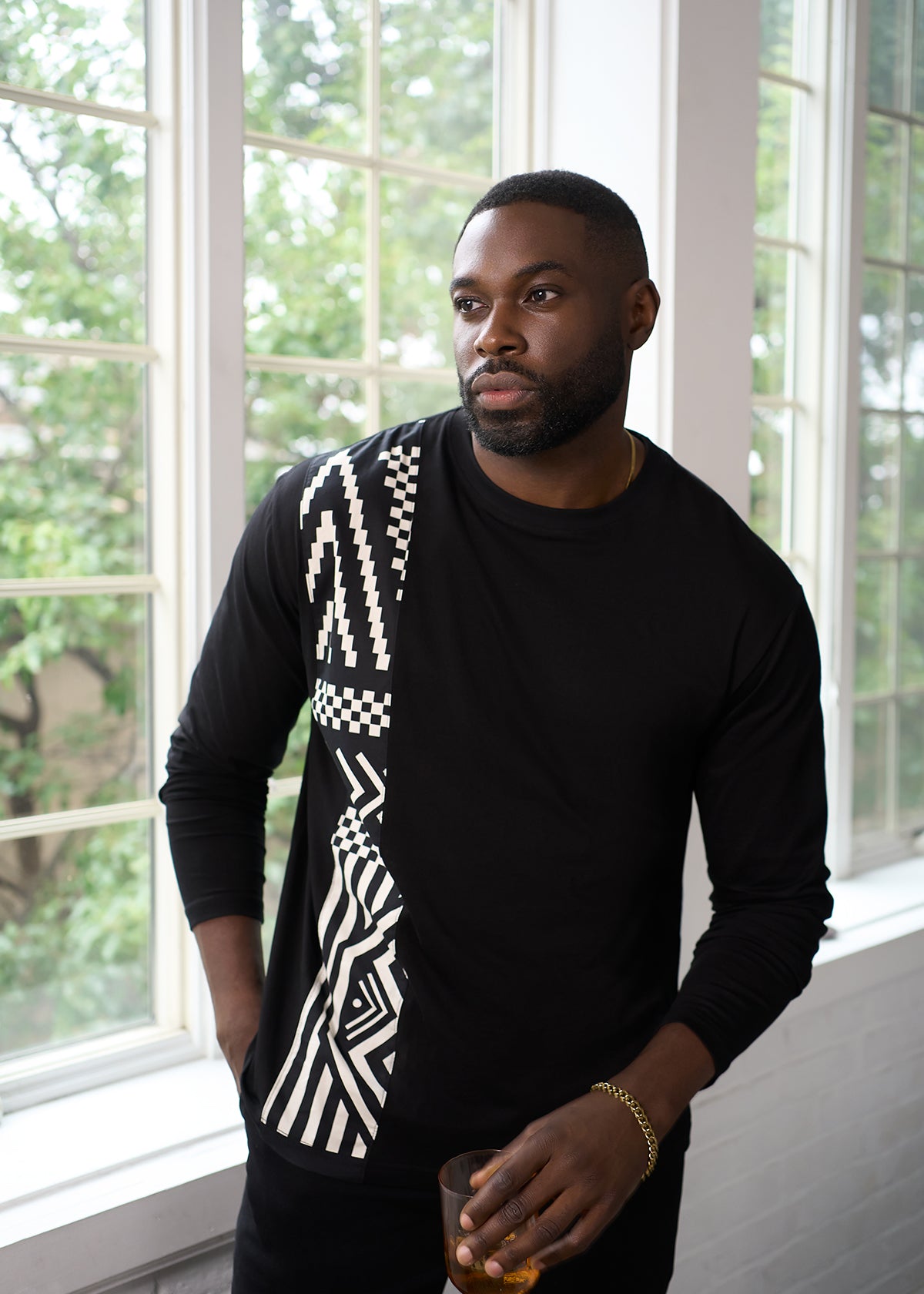 The Addo T-shirt is not your average tee with the bold African-printed appliqué. Be bold in your basics with D'IYANU's men's t-shirt collection.