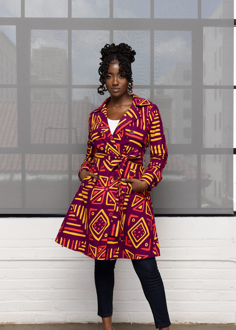 Compliments guaranteed every time you step out in this boldly printed trench coat that hits just above the knee.