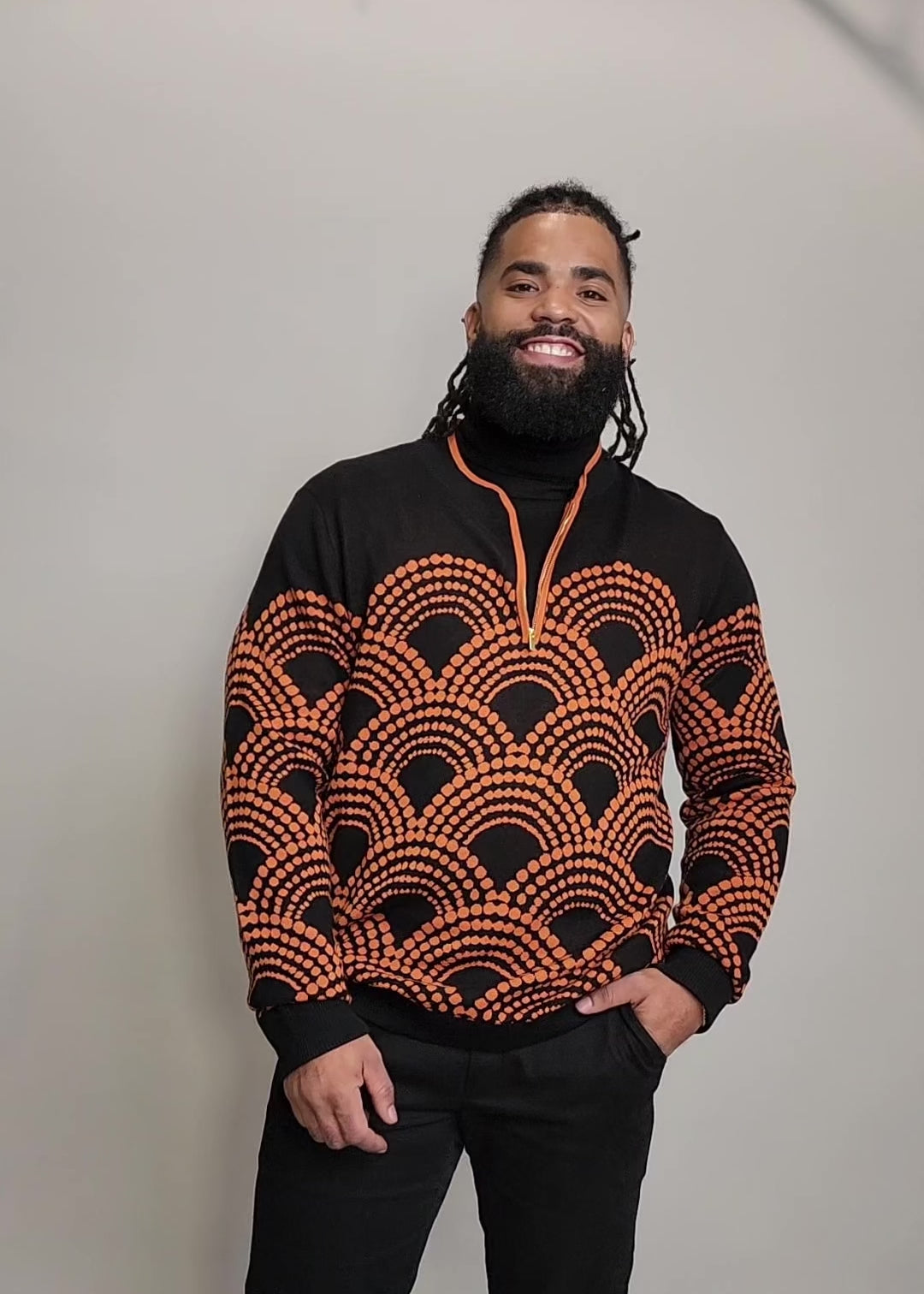 Cozy up this fall in the Kibo Men's African Print Quarter-Zip Sweater in Black Amber Dots. It's the perfect layering piece that spices up any outfit.