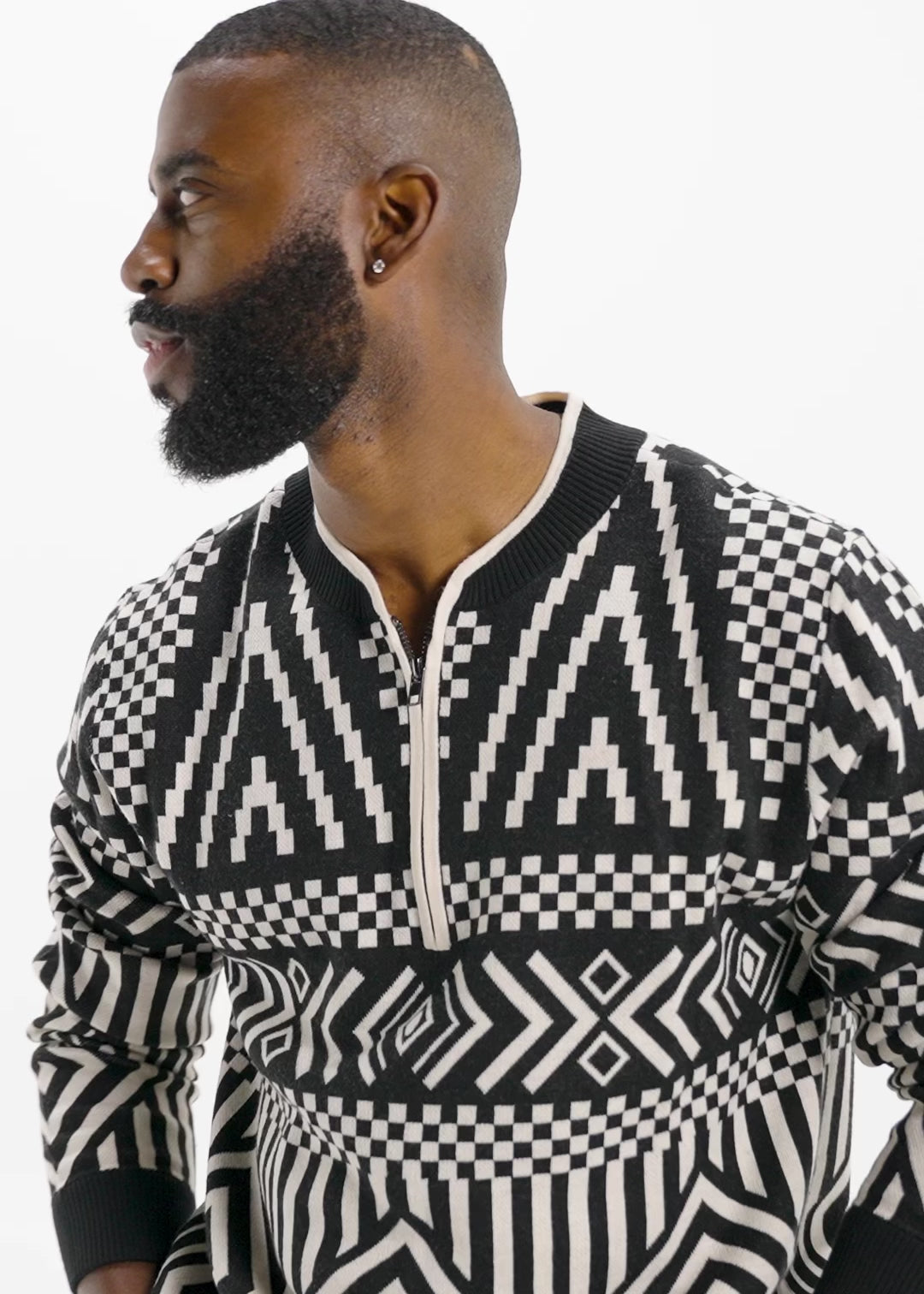Cozy up this fall in the Kibo Men's African Print Quarter-Zip Sweater in Black Cream Tribal. It's the perfect layering piece that spices up any outfit.
