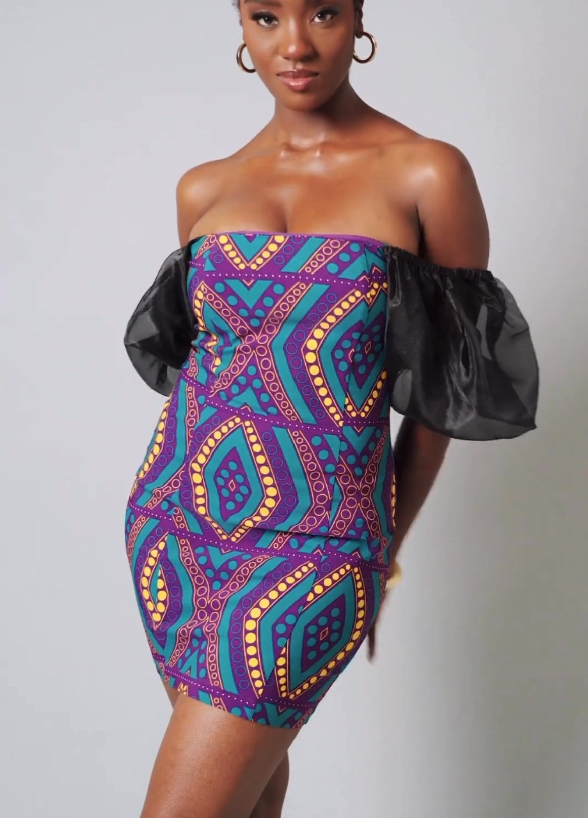 Get your flirt on in the sexy Nayana mini dress with organza puff sleeves. This little number is sure to turn heads with its unique African-inspired print and bodycon fit.