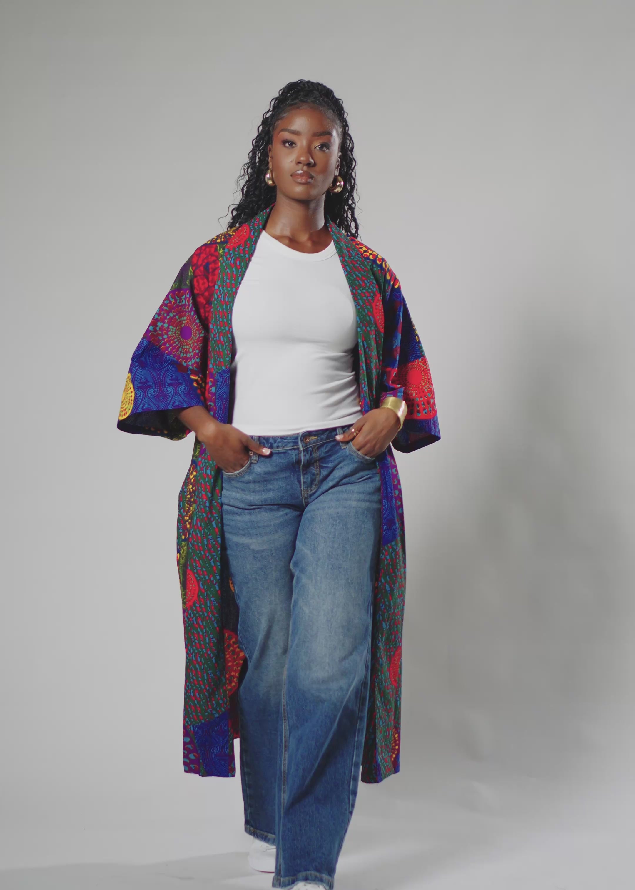 The Ondina Women's African Print Kimono in New Harvest Multipattern is the perfect statement piece for layering. Pop it over a swimsuit to elevate your look or wear it over a basic tank top for an instant glow-up. Lightweight and flowy, you can't go wrong with this effortless addition to your outfit. Shine wearing our take on a traditional African Ankara print.