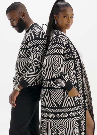 Meet the coziest statement sweater perfect for the colder months, the Oratile cardigan. This duster-length sweater is thick, soft, and makes a bold statement with the Black Cream Tribal print.