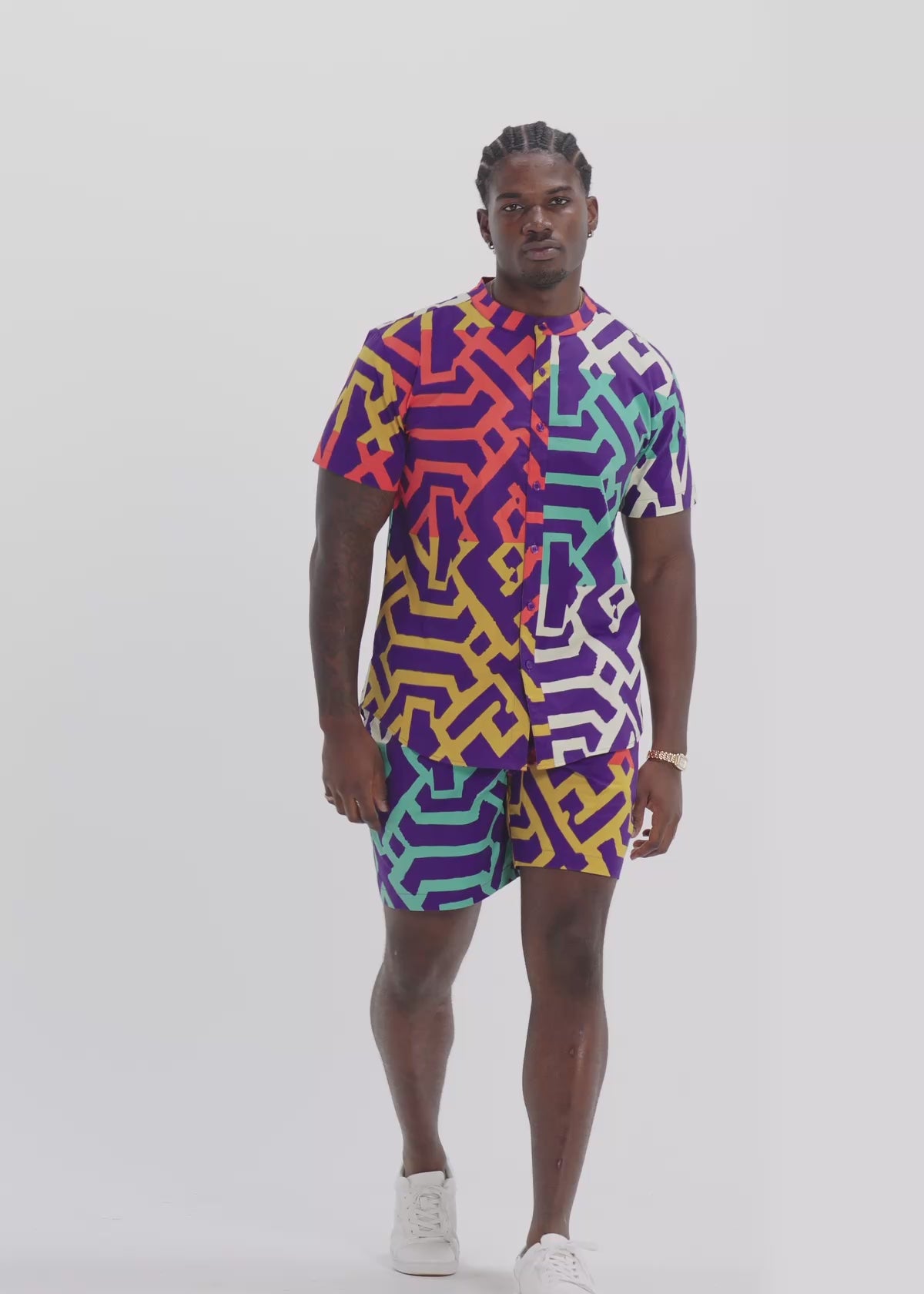 Bold print, clean structure. The Oumar Mandarin Button-Up Shirt in Purple Multicolor Tribal keeps the focus on color with a sharp, modern silhouette. The mandarin collar adds a refined edge, while short sleeves and a rounded hem keep it easy to wear. Simple cut, strong presence.